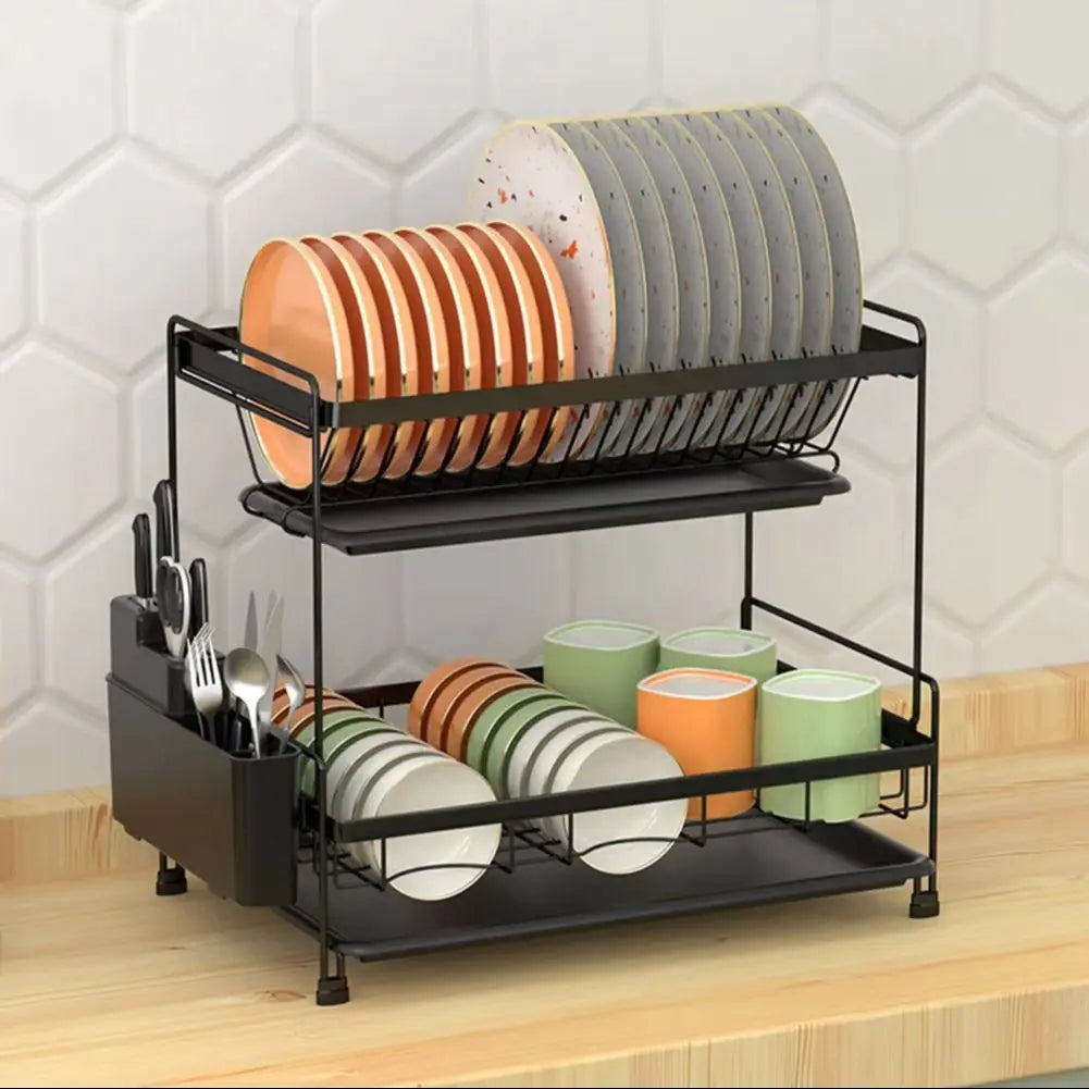 This compact yet functional dish drying rack is designed to maximize vertical space, making it perfect for smaller kitchens. It can hold a variety of dishes including plates, bowls, and pans. It comes with a removable utensil holder, ideal for cutlery like knives, forks, and chopsticks. The modern and sleek black design ensures it blends seamlessly with your kitchen décor, and it’s perfect for countertop placement.